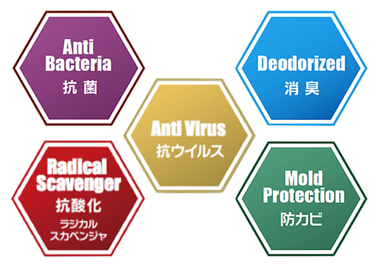 防カビ、消臭、抗酸化の5つの効果を長期間持続致します。