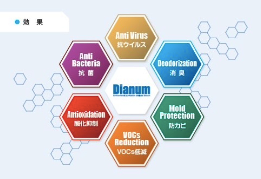- 技術は科学的に安定し、光や温度の影響を受ける事なく安定した効果を塗布するだけで長期間発揮します。 従来の酸化チタンを用いた光触媒では強い光や強い紫外が必要となるが、 ダイヤニウムは光や紫外線を必要としない為、光触媒では有効に機能を発揮できない屋内や暗所でも使用でき様々な用途が期待できる。
