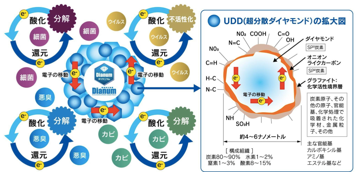 - また、このナノダイヤモンドはSP2炭素の異なった電位の表面構造を持ち合わせているため、電荷移動が起こり、 接触した物質に対し酸化還元反応を起こし、ウィルス類や細菌類、カビ類、悪臭成分類に対して分解作用をもたらす。